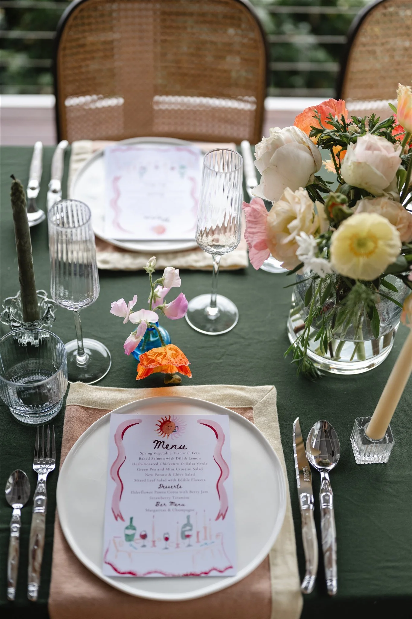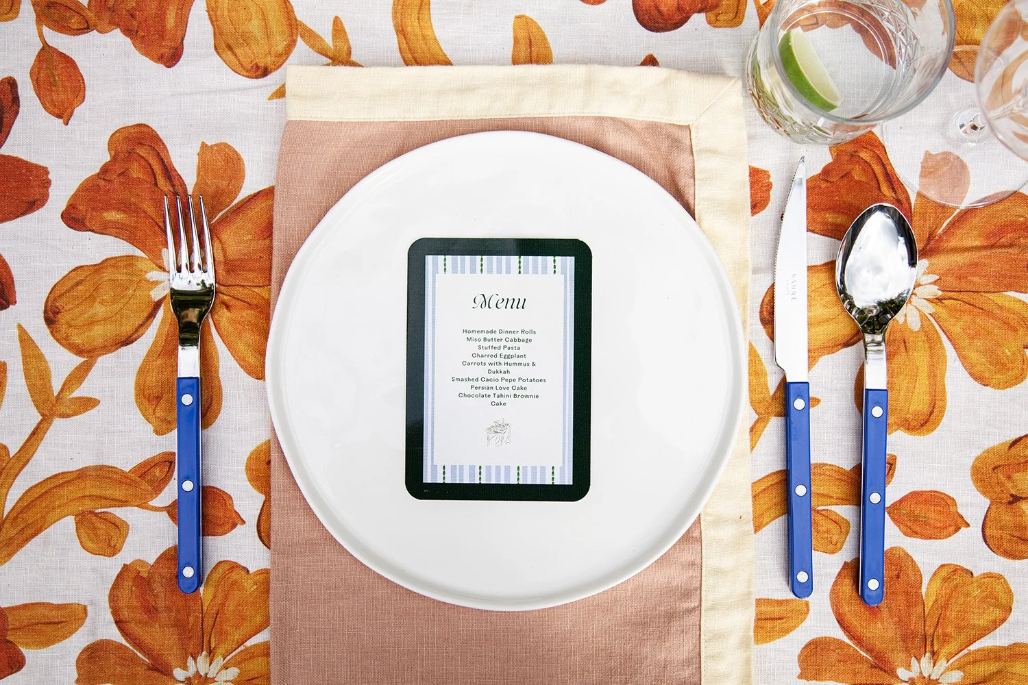 Print or handwrite a simple card with the courses listed. Place one at each setting or stand one in the centre of the table. It gives guests something to read as they sit down, it signals that the meal has been thought about, and it is a remarkably simple detail that reads as formal without requiring formality.