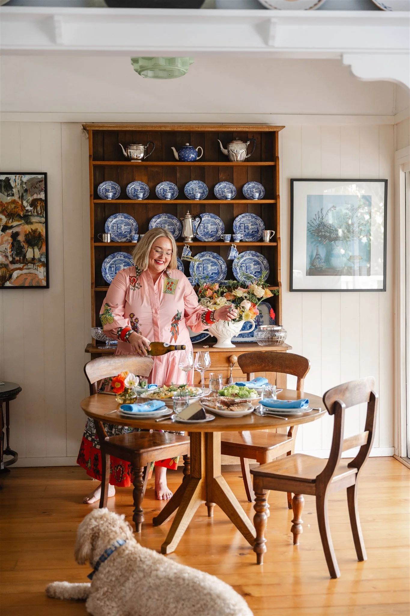 No tablecloth: Works well on a beautiful timber or stone surface. Use placemats — linen, woven jute, or leather — to define each setting and protect the surface. A table runner down the centre adds visual structure without covering the whole table.