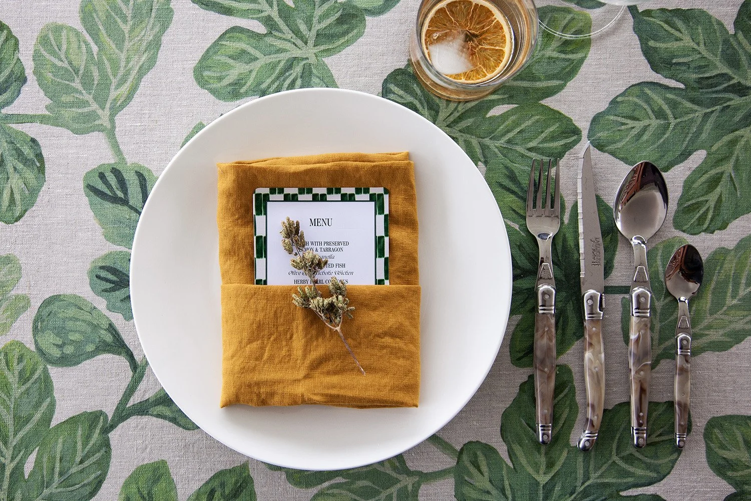 Match napkin colour to your tablecloth or placemats, or use it as a deliberate contrast. A terracotta linen napkin on a white tablecloth. A deep blue napkin on a natural linen base. The contrast should be intentional, not accidental.