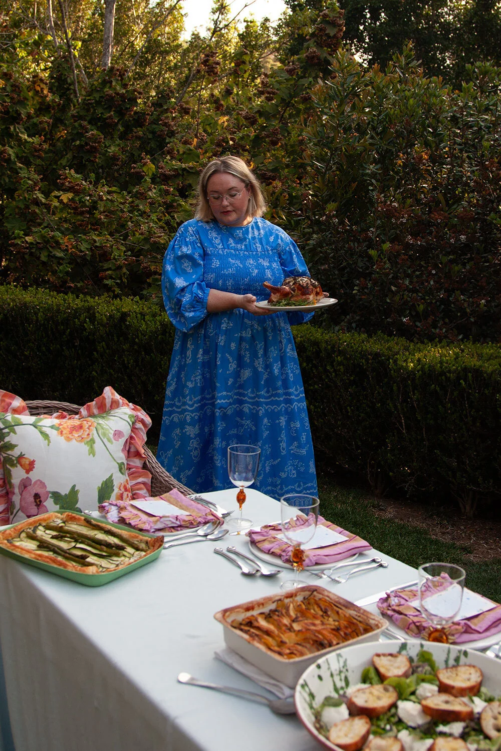 Serve mains on shared platters rather than individually plated. It suits the setting, encourages people to linger, and means you are not trying to carry eight hot plates across a garden.