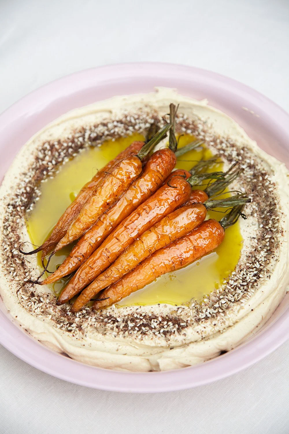 On a large serving platter smooth the Hummus out over the surface. Lay the Carrots over the top of the Hummus in the centre, and pour the carrot top Oil over the top of the Carrots. Finish with the dukkah sprinkled around the edge of the Hummus