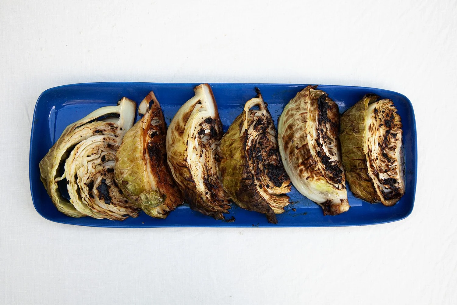 Heat a grill on a high heat, you could use the BBQ too. Putting the cut and buttered sides face down, grill the cabbage until charred