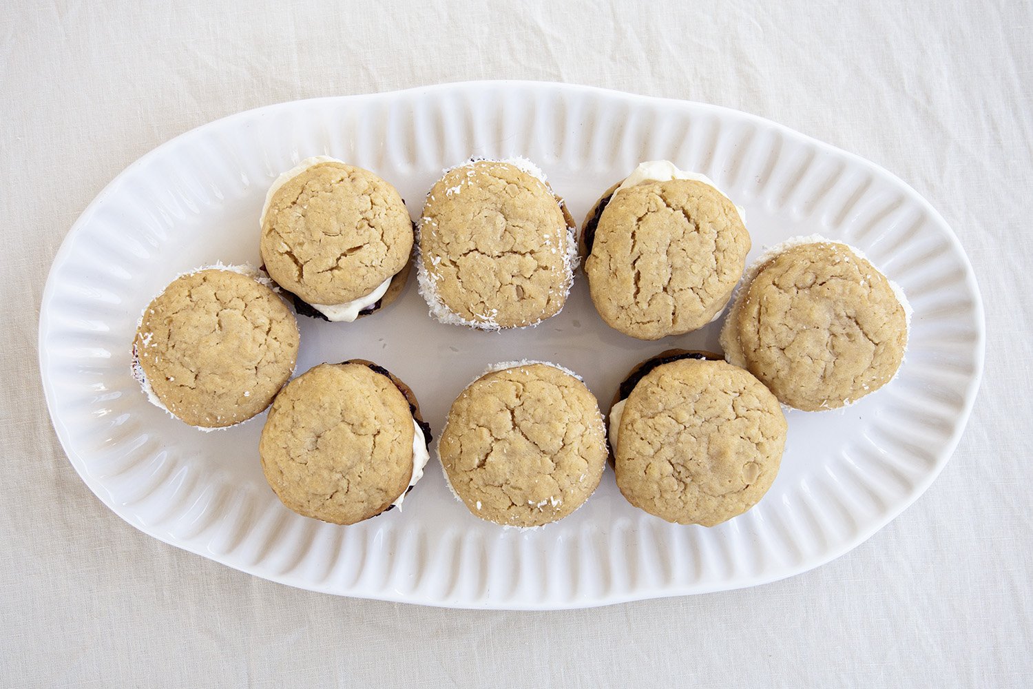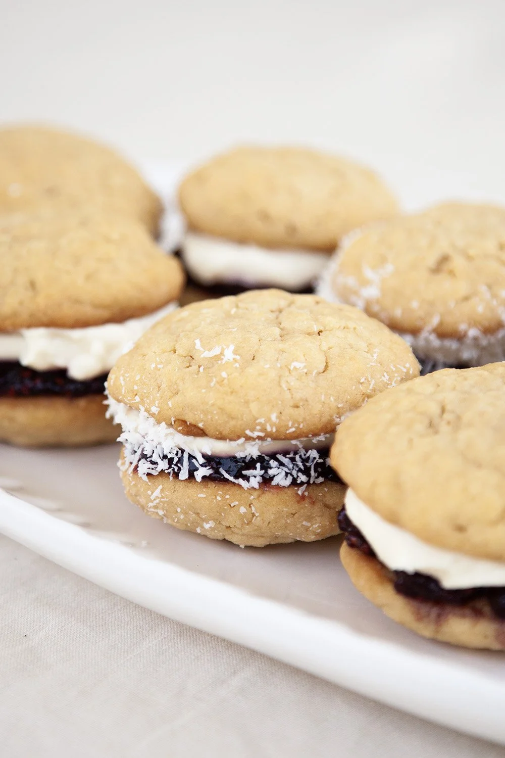 Assemble the cookies, spread a generous layer of jam on the flat side of one biscuit. Pipe or spoon a thick layer of the cream cheese filling on another biscuit and sandwich together