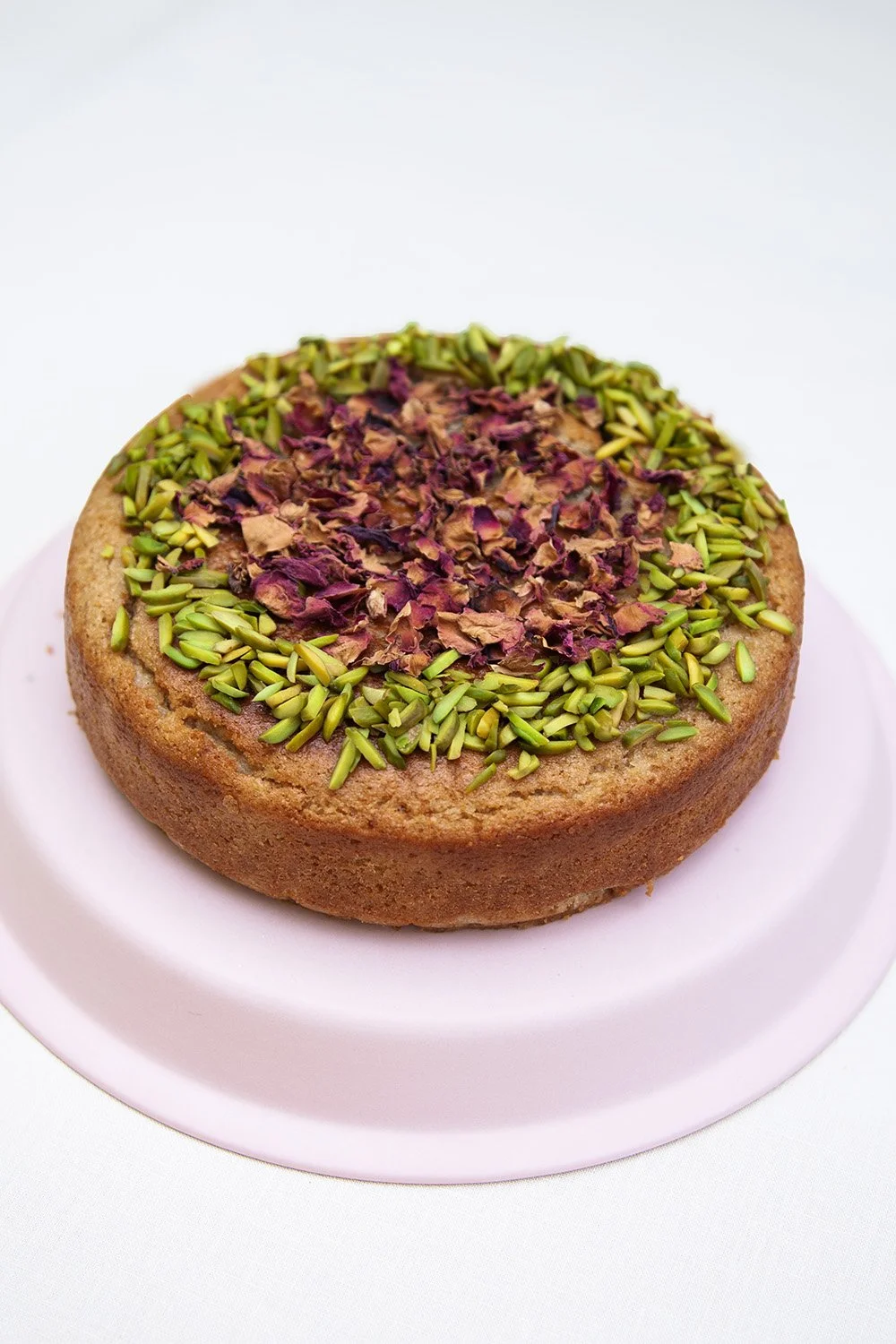 Cool completely, then sprinkle with crushed pistachios and dried rose petals before serving.